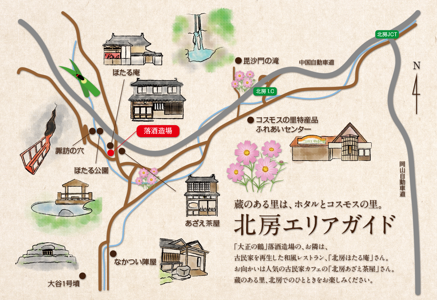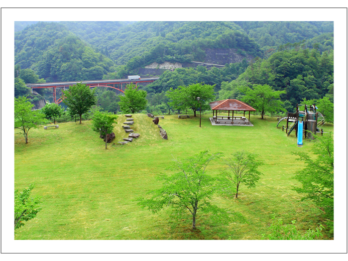 北房ダムを見下ろす高台にあり、春は桜。秋には紅葉とダム湖畔の景色を楽しむことができます。